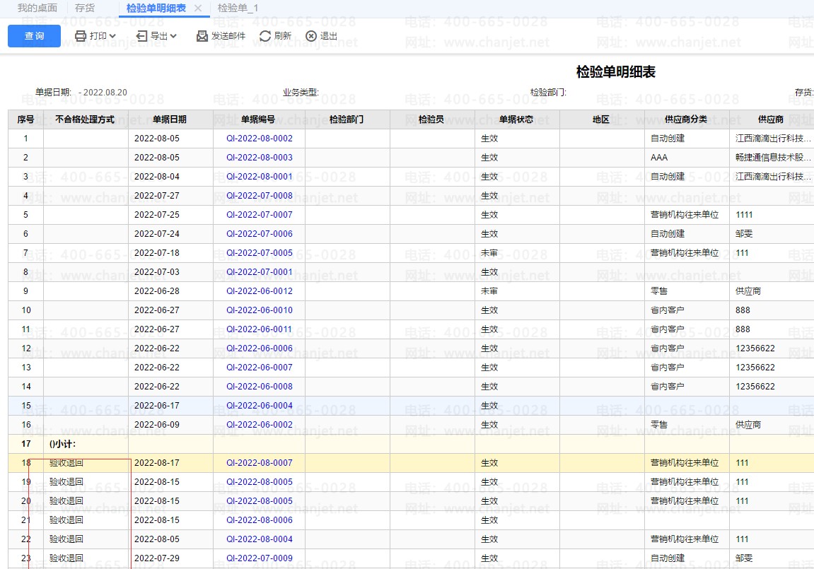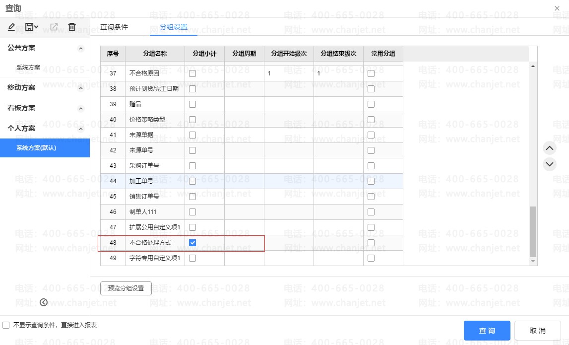 2、在明细表条件中,设置不合格处理方式做分组小计
