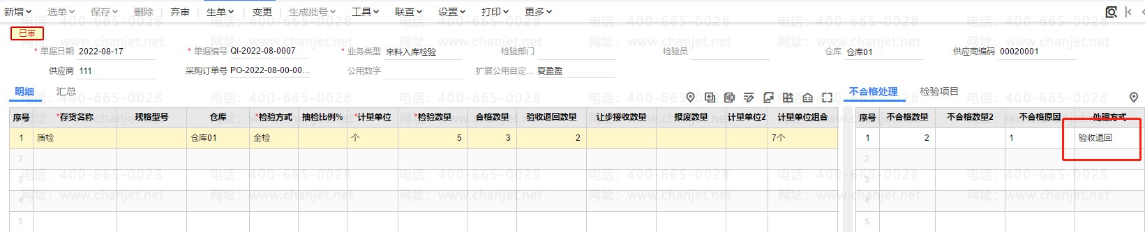 在T+中,检验单明细中已经有不合格处理方式,但是查明细表有这个字段,内容为空