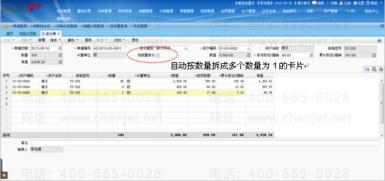 多数量卡片如有变动的情况下,需要将资产片进行拆分后,分别进行业务处理。如原资产卡片数量为100,盘点后,有2个丢失,8个管理部门发生变化。则需要将这些发生变化的资产卡片拆出后进行后续业务处理。
