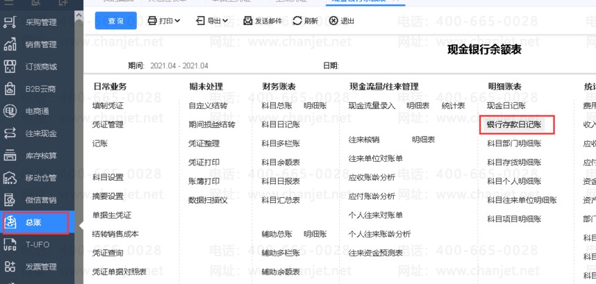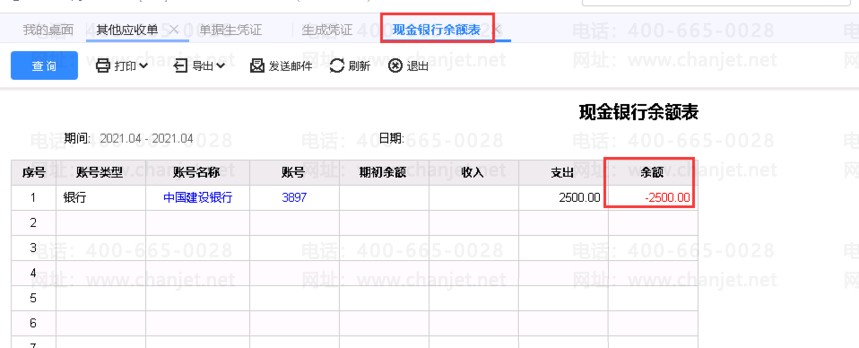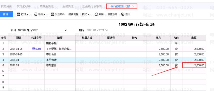 凭证保存后,查业务的现金往来-->现金银行余额表,及总账-->现金银行日记账如下图所示(两者是相等的)。