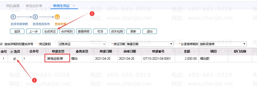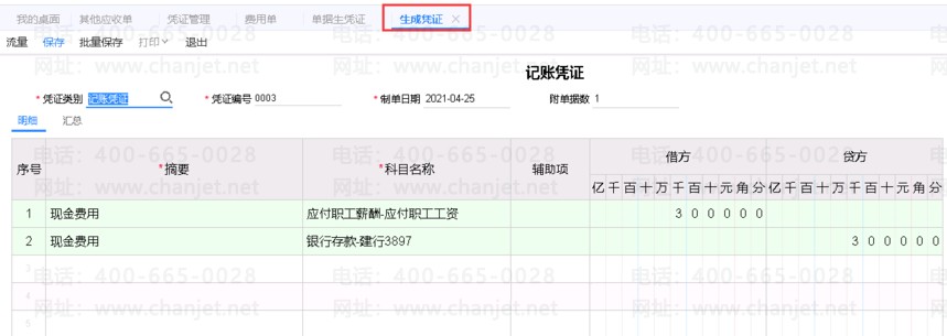 单据生成凭证如下所示:
