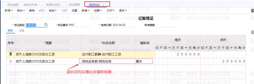 3、借款的部份抵工资,直接在总账做凭证 如下图所示: