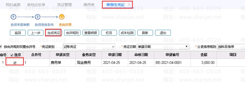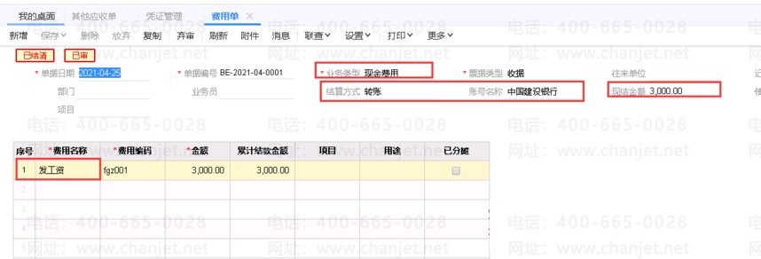 4、剩余部份3000元,业务中做费用单,业务类型为现金费用。