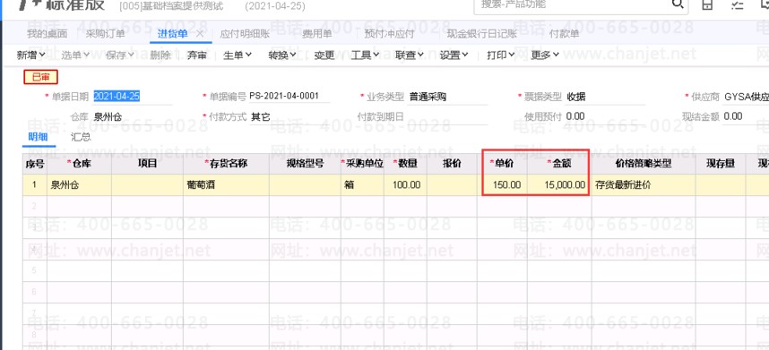 3、采购订单总金额为20000元,进货单总金额为15000元,付款进按20000付款其中,5000元转为预付款,做付款单如下所示;