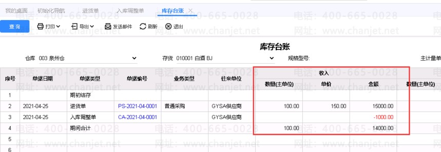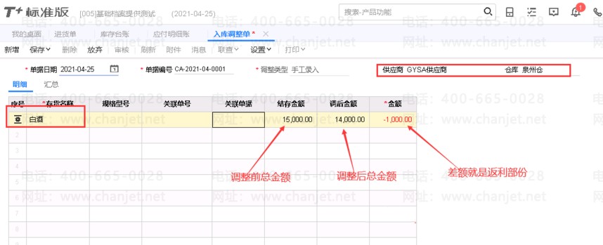 2、接下来我们做一张反利的入库调整单把成本金额调下来,如下图所示: