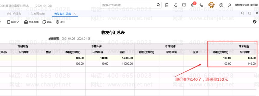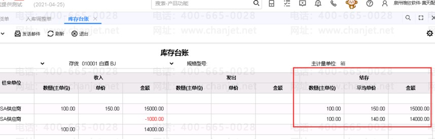 3、做完后,进货单价格是不变,供应商要自已做相关单据冲掉应付款(如果涉及到应付的,可以做其他应付单、费用单等。但结存成本会变如下图所示: