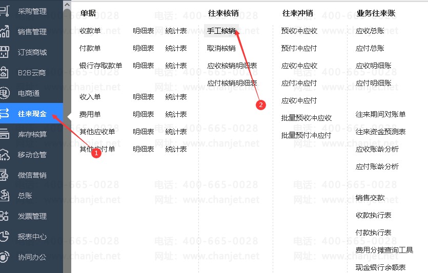 2、后续,开完销售单后,再到"往来现金"-->"手工核销"中操作,如下图所示;