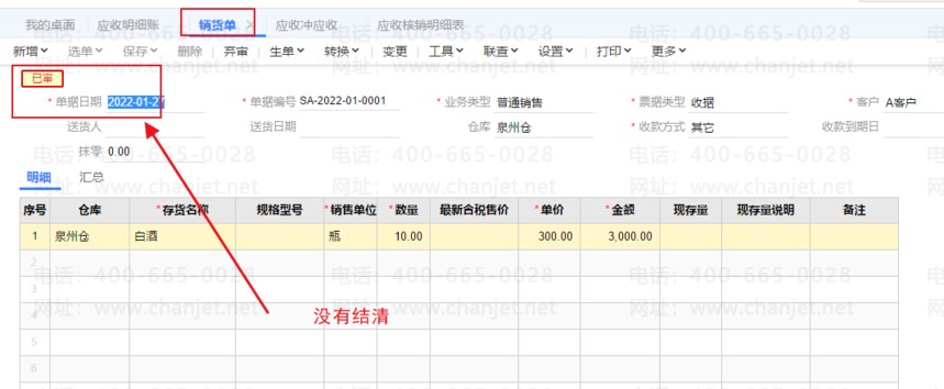 查应收核销明细,及销货单两个分别都没有核销金额及销货单也没有结清,如下图所示: