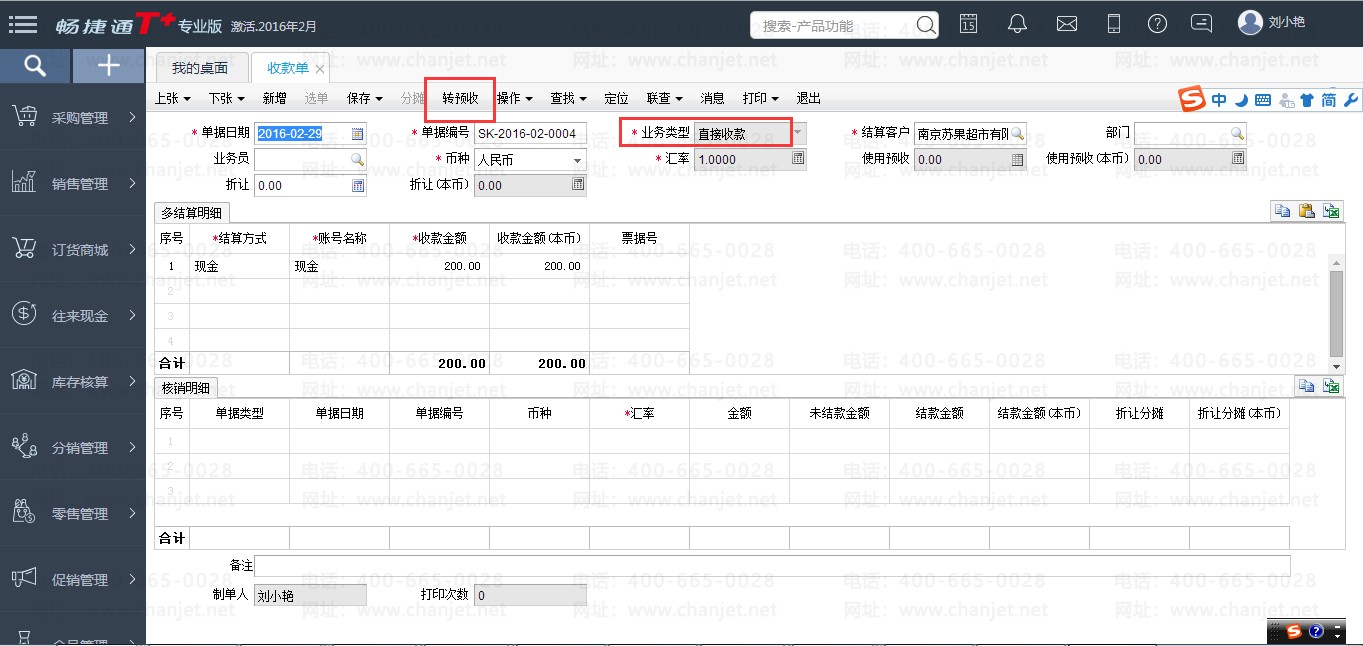 直接收款一般用于公司收到客户的款项,暂不知核销的是哪笔应收单据,或者收到款项不进行核销时不想确认为预收账款的情况,直接收款的收款单生成凭证科目默认为应收账款。填制一张直接收款的收款单,单据保存之后会出现“转预收”的按钮,后续也可点击转为预收款。
