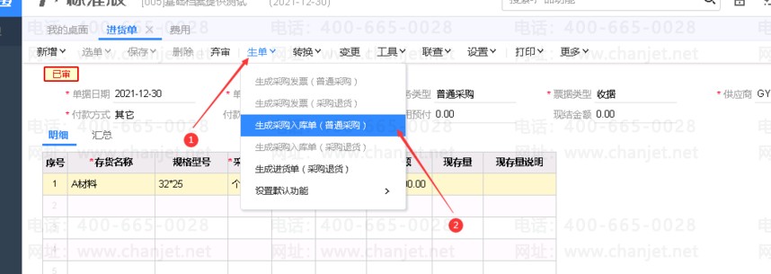 2、生成采购入库单;