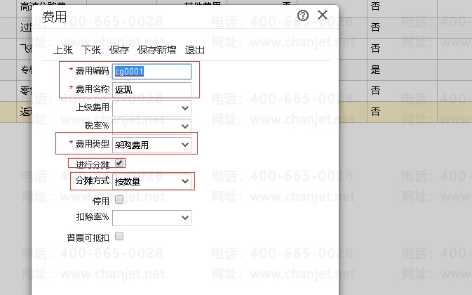 3、基础设置-->费用,增加一个类型为采购费用,返现的,并要勾选分摊,按数量;