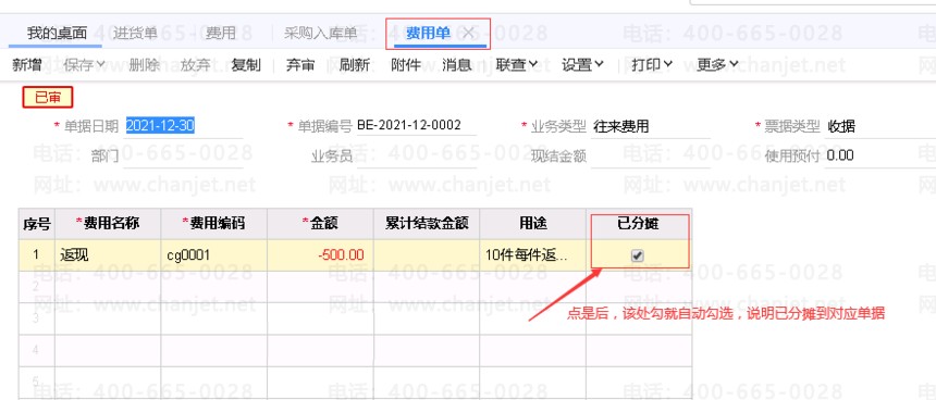 6、查看自动生成的费用分摊单据,如下图所示;