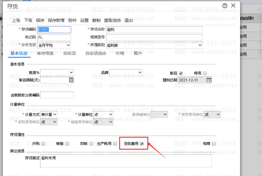 1、存货去加一个劳务类的存货,如下图所示: