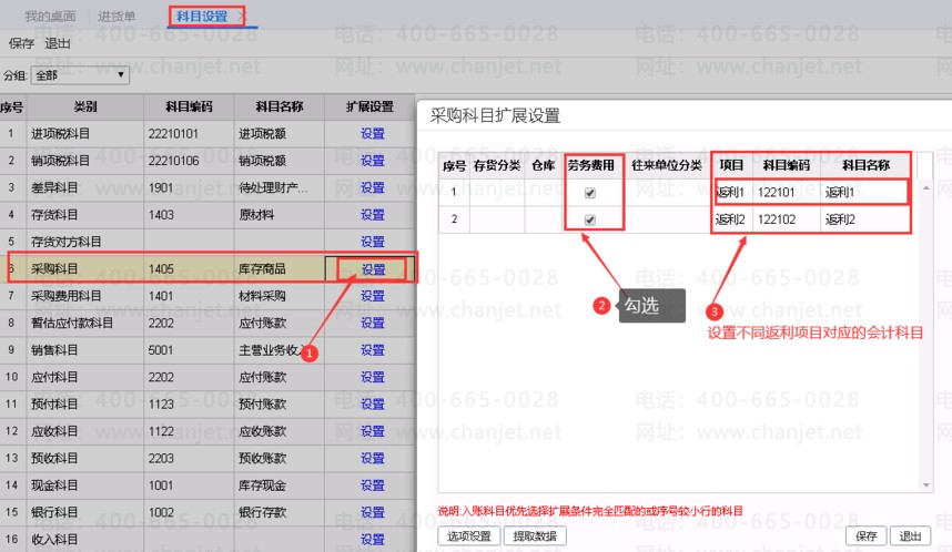 3、科目设置,对应的返利科目与项目名称对应,如下图所示: