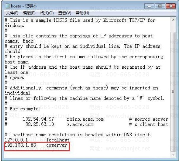 进入系统(以系统盘是C盘为例)C:\Windows\System32\drivers\etc ,该目录下有一个文件hosts,用记事本打开hosts文件,并在文件尾部新增一行记录,填写上服务器的IP地址和主机名,IP和计算机名空格使用tab键隔开。比如服务器的IP地址和主机名分别为192.168.1.88和CWSERVER,则配置如下: