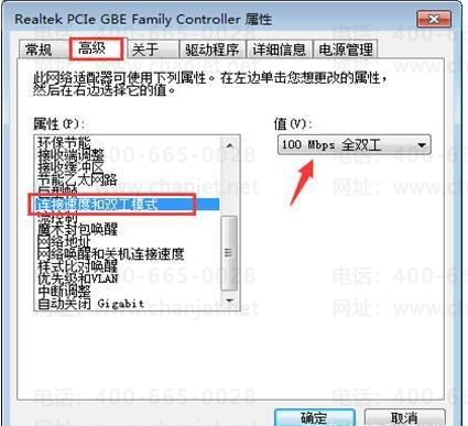 4、在网络共享中心--本地连接--属性点击配置,将“连接速度和双工模式”选择100mps,如图下操作: