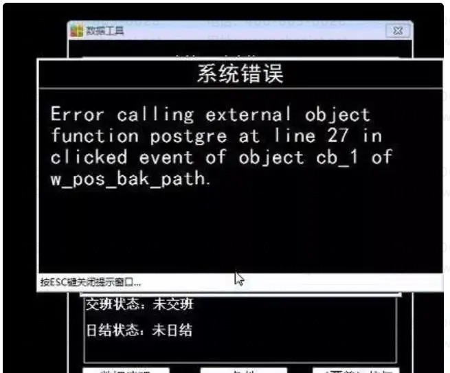 Q4:pos端点击“备份”时提示:系统错误error calling external object function postgre at line 27 in clicked event of object cb_1 of w_pos_bak_path。