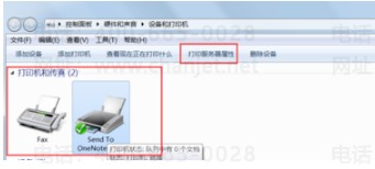 2、或者打开“控制面板\硬件和声音\设备和打印机”找到我们要设置的打印机如下图,选择对应的打印机可以看到菜单栏下面有对应的菜单按钮“打印机服务属性”;