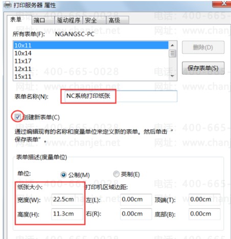 4、进入眼帘的是事所有的表单,这里我们要系统打印机新增打印纸张的添加,勾选“创建新表单”输入纸张名称和纸张大小:宽22.5高11.3,纸张大小可以用尺子进行量一量进行添加;