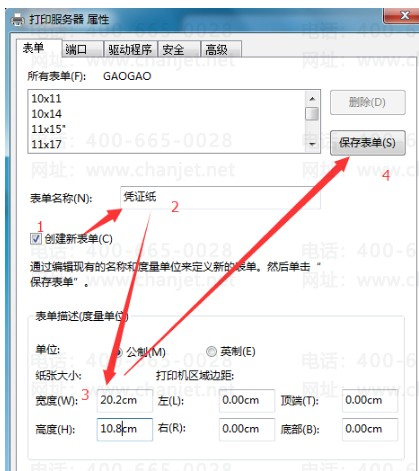 3、在“创建新表单”处打上对勾,然后录入表单名称,然后录入纸张尺寸,然后点击保存表单。
