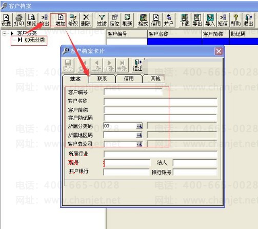 5.再点击‘增加’按钮,增加客户档案。如下图: