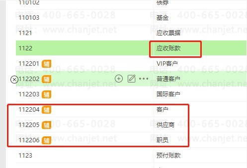 b.再在【应收账款】下添加三个明细科目,分别针对新增的三个明细科目分别挂上【客户】、【供应商】和【职员】的辅助核算;
