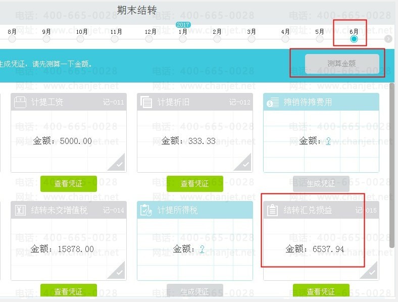再点击【测算金额】,鼠标放在结转汇兑损益框内的金额处,录入外币的汇率,然后【生成凭证】保存即可
