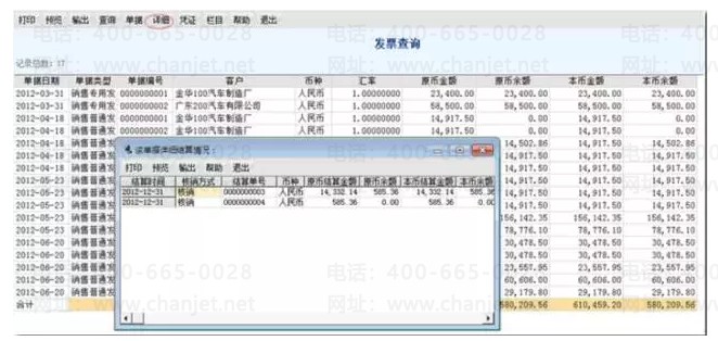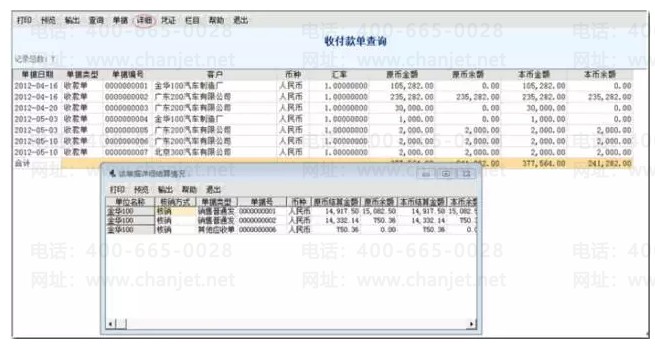 应收应付模块,通过“详细”查看首付款单和关联发票的核销情况。