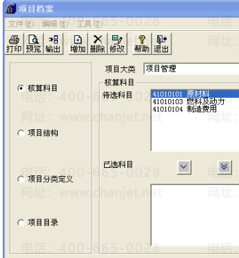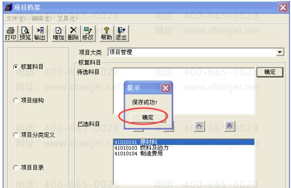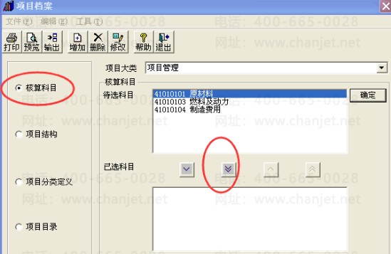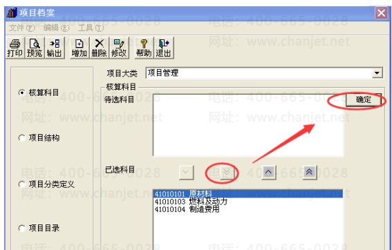 3、【项目大类】中选中对应的项目,【核算科目】下把【待选科目】框中的科目选到【已选科目】框中,点击【确定】;如下图