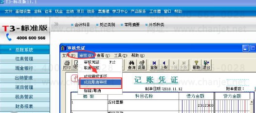 5、进入某一张凭证,弹出审核凭证窗口后,点击左上角的“审核”-“成批取消审核”,如下图: