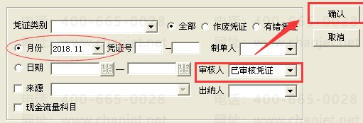 3、在“凭证审核”界面,点击审核人下拉框的下拉按钮,选择“已审核凭证”再对其他过滤条件进行设置,设置完成后点击“确认”,如下图: