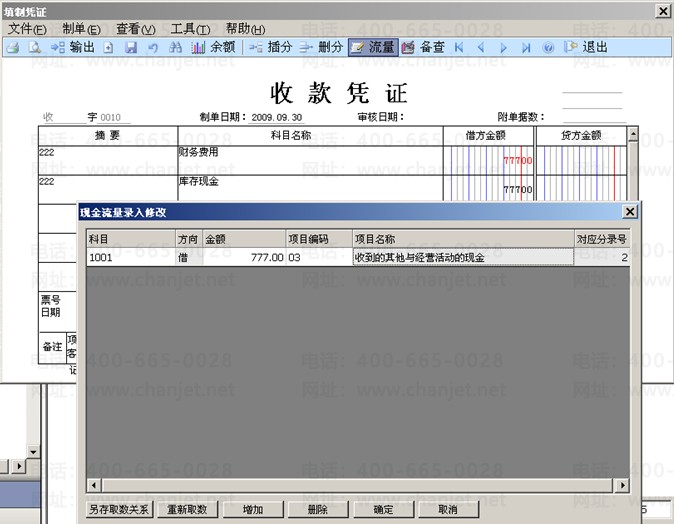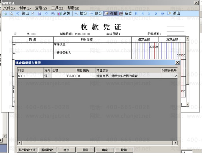 (2)直接点击保存按钮,如果事先进行了取数关系定义,那么系统自动填入现金流量项目,没有任何提示;如果没有事先进行取数关系定义,那么系统会弹出现金流量录入界面要求用户进行分配。