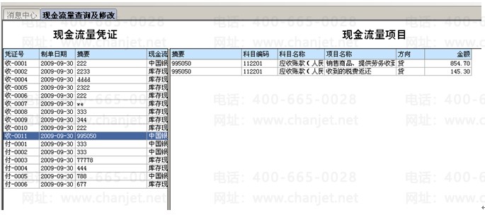 使用本功能可以按照已记账、未记账和全部凭证,或按已填流量项目、未填流量项目等不同的查询范围查看现金流量凭证。并可以对已分配的现金流量进行修改。左边显示现金流量凭证表,右边显示与左边凭证对应的现金流量项目。在左边的现金流量凭证表中选择要修改的现金流量凭证,点击"修改"按钮显示现金流量表修改窗口,在窗口提示中修改。