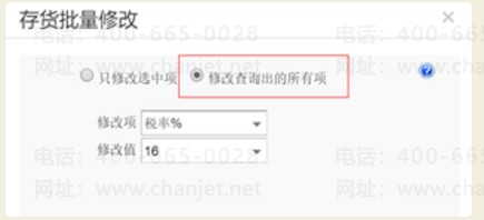 在【存货批量修改】的界面:建议选择【修改查询出来的所有项】,【修改项】选择【税率%】,【修改值】输入正确的税率值。