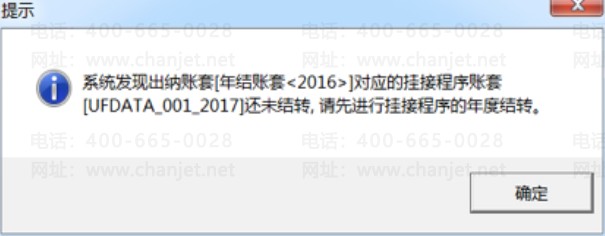 2.如果出纳账套与总账账套挂接一起,那总账要先年结,才能做年结。否则就会有下面的提示: