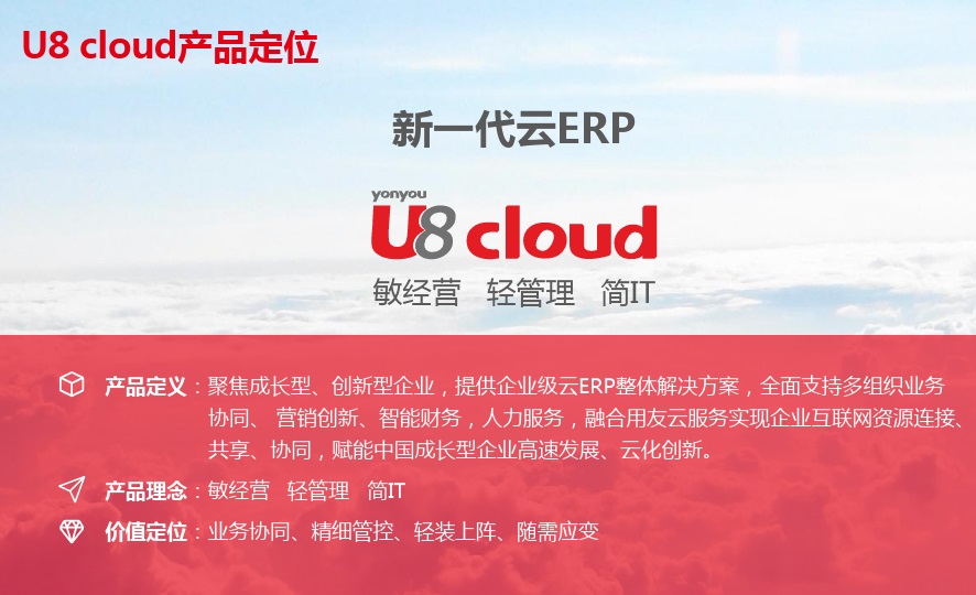 用友U8财务软件新一代云ERP不是仅仅可以解决成长型、创新型企业的成本问题、效率问题,还在商业定位上,支持企业进行商业再创造。为企业上云提供了最佳的路径选择!