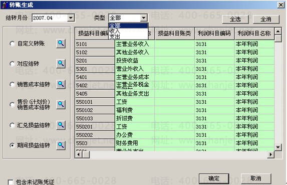 做结转损益的凭证之前,前面的凭证必须先审核、记账后,才能自动结转出凭证→点总帐→点期末→点转账生成→选择期间损益结转→选择结转月份→选择类型(收入)→全选→点确定→出现凭证界面后→检查数据是否正确→保存→退出→做支出的结转。