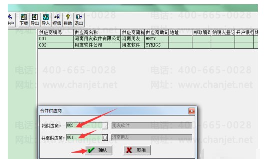 3、将被合并的供应商放在上面,需要合并的供应商放在下面,选择的时候点击里面的小按钮,选择好以后点击确定;