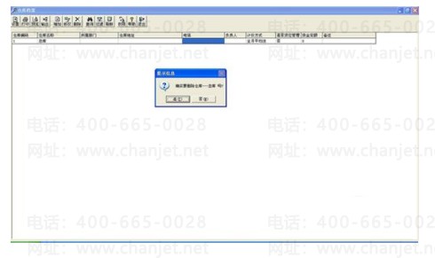 6、如果仓库档案设置错了,可以进行修改,当然也可以进行删除。选中要删除的仓库档案,点击最上面一栏的“删除”按钮。就会弹出提示框“是否要删除仓库——总库”,如下图: