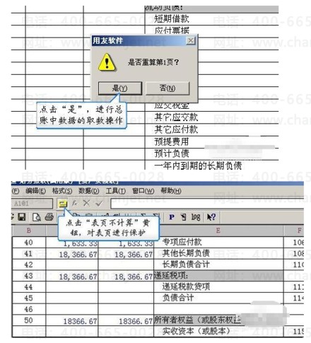 5、系统提示是否重算第一页。点击确认。我们就能算出当月的财务报表,在算出报表后,点击表页不计算按钮,对表业进行保护。