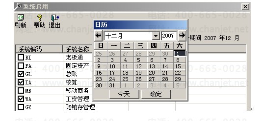 系统管理→系统→注册→用户名为账套主管→确定→账套→启用→点击选择GL总账前面的□→选择启用日期(可选择任意年度与月份,但启用日期为通常启用月的1日)→确定→“确实要启用当前系统吗?”→是→完成所有系统启用后→点退出