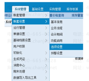 2、在系统管理下面,找到账套设置——选项设置,这里会弹出来一个对话框,在上面的一排可以找到财务。