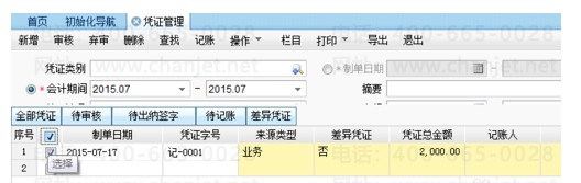 5、选择你要记账的凭证(如果要全部取消反审核,就在“序号”后面的正方形里打勾),点击左上角的“记账”即可。