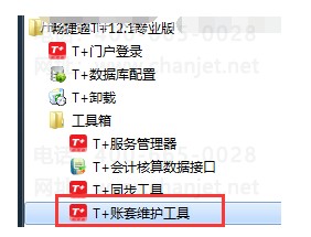 2、另一种是通过软件自带的用友T+账套维护工具来完成,在开始菜单程序里面,找到畅捷通T+V12.1专业版,展开工具箱,找到T+账套维护工具,如下图所示: