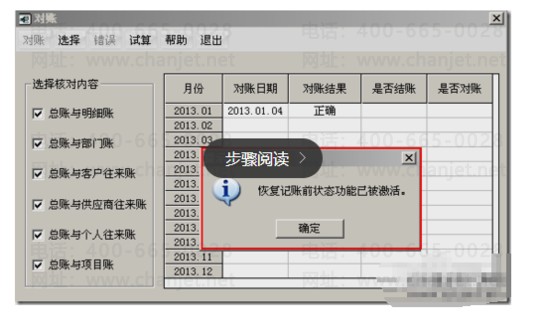 二、在对账界面按“Ctrl+H”,系统提示“恢复记账前状态已被激活”,点击“确定”,然后点击“退出”按钮。