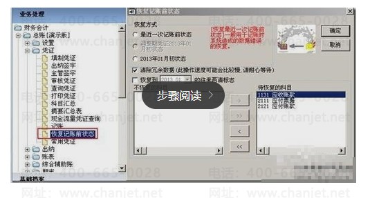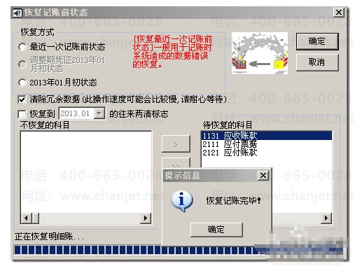 选择好恢复方式及待恢复科目等,点击“确定”。