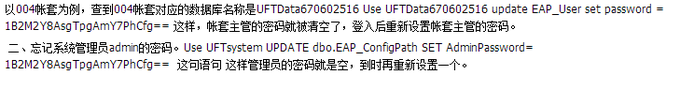 一、忘记的密码。首先, 进入企业管理器, 找到UFTSystem数据库的EAP_account表,因为新一代中的数据库帐套号是加密的,不能确定是哪个号对应的数据库名称是哪个,所以先得找到某帐套的cAcc_name对应的Ds_name。