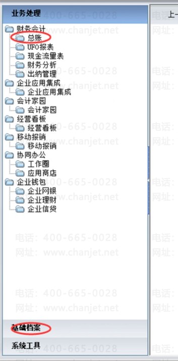 一、打开界面可以看到左边有几个菜单,其中业务处理下面的“总账础档案”为所有基础资料的设置,如下图: