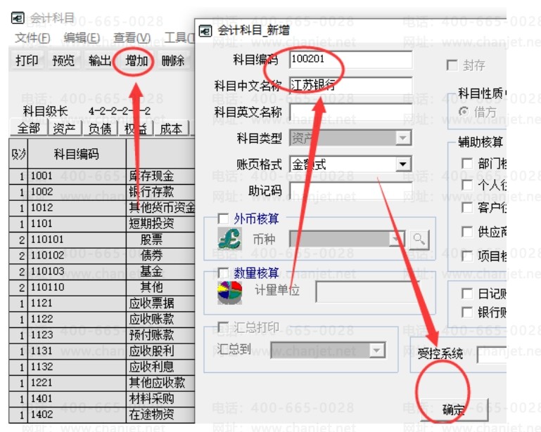 我们这里以银行存款为例:点增加,弹出的框子里面先输入银行二级编码的位数为2,则二级科目编码为“10020”如上图。名称辅助核算设置:一般要设置辅助核算的科目有“应收账款”、收和其他应收挂“客户往来”,“应付和其他应付”挂供应商往来。