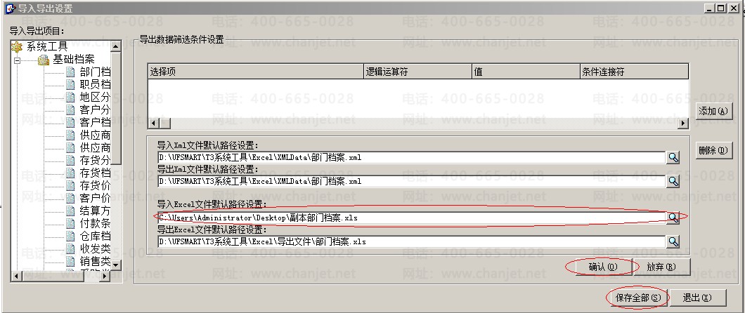 7、单击左侧要导入的档案,在右侧导入Excel文件默认路径设置中选择文件路径,单击确认和保存全部。
